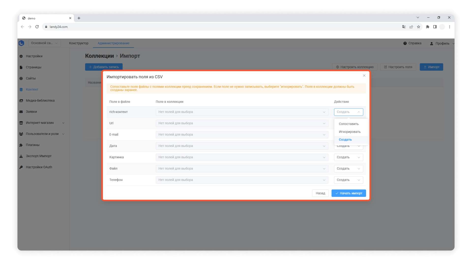 Поля в коллекции могут быть созданы заранее или выбрано действие "Создать".