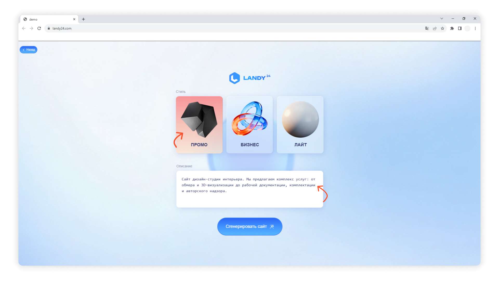 Дальше всё просто. Выбираем стиль будущего сайта, пишем короткое описание (что это вообще будет) и жмём кнопку «Сгенерировать»